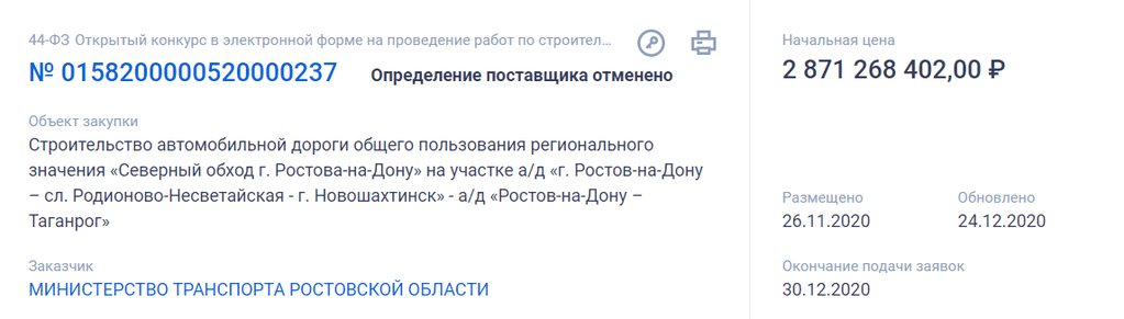 Стало известно об отмене тендера на определение подрядчика для строительства выхода дороги А-280 «Ростов — Таганрог — граница с Украиной» на М-4 через Новошахтинск. Как оказалось, открытый конкурс с начальной ценой более 2,8 миллиардов рублей был отменен еще в конце декабря 2020 года.