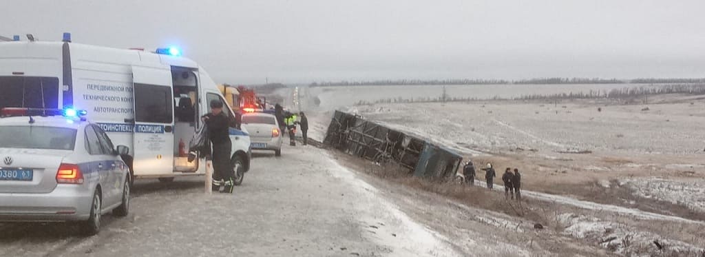 Сегодня в седьмом часу утра в Ростовской области на трассе М-4 «Дон» автобус Mercedes-Benz, следовавший по маршруту «Москва — Донецк (ДНР)» съехал в кювет и перевернулся.