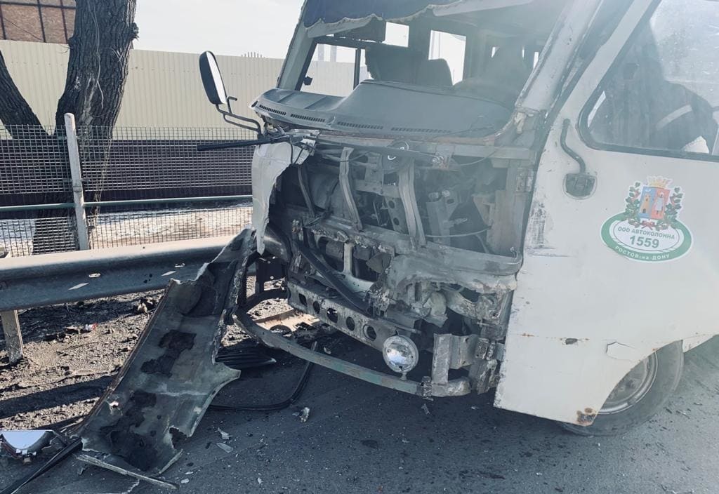 Сегодня днем на выезде из Ростова рядом с рынком Овощным, что в Аксайском районе, столкнулись маршрутка Hyundai County, принадлежащая «Автоколонне 1559», и тягач КАМАЗ.