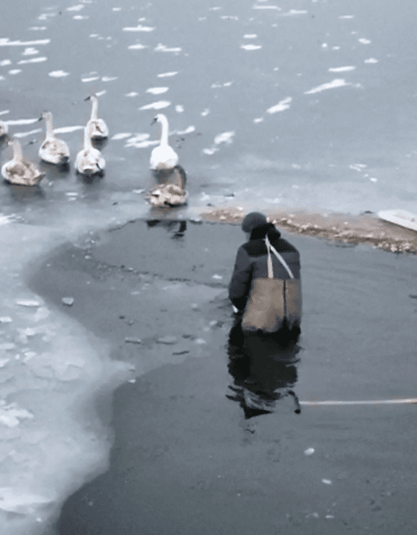 Один из местных жителей надел гидрофобный костюм и спас птиц — прорубил к ним полынью и аккуратно освободил их от наледи. Лебеди, уже привыкшие к людям, перенесли эту операцию стоически.
