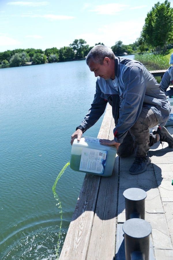 В реку Дон они запустили 400 литров биоактиватора на основе планктонной хлореллы, который не только сдержит распространение сине-зеленых водорослей, но и станет хорошей «витаминной добавкой» для живущих в Дону рыб.