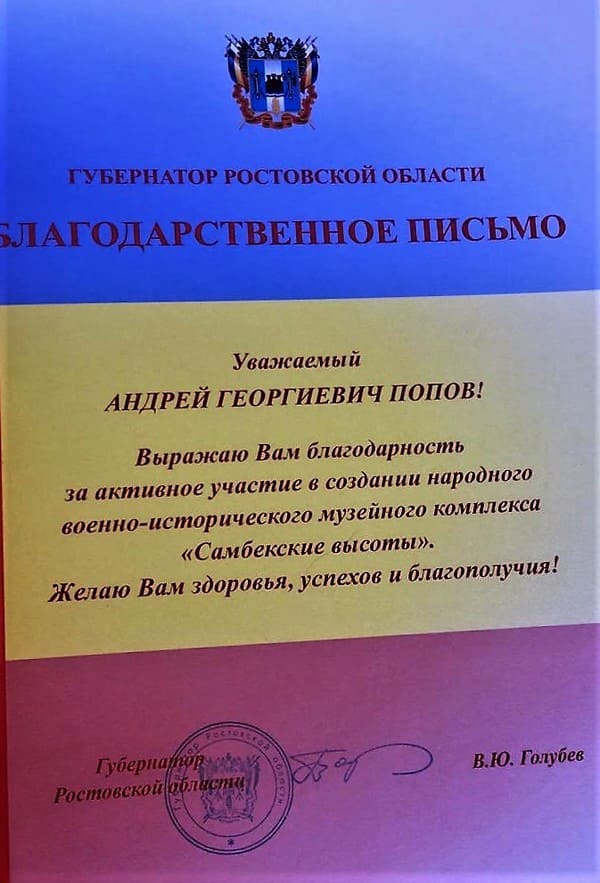 Десятого июня благодарственного письма донского губернатора Василия Голубева был удостоен командир вёшенского поискового отряда «Патриот» Андрей Попов.