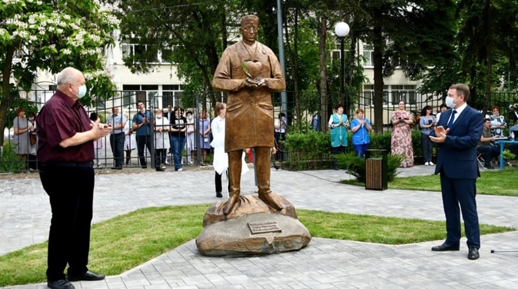 Подарок ко Дню медика — бронзовую скульптуру врача и арт-объект — установили на проспекте Ленина в Аксае.