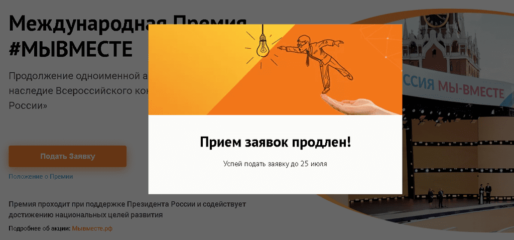 Оформить заявку проекта на премию, ставшую логичным продолжением всероссийской акции взаимопомощи #МыВместе и конкурса «Доброволец России», можно до 25 июля