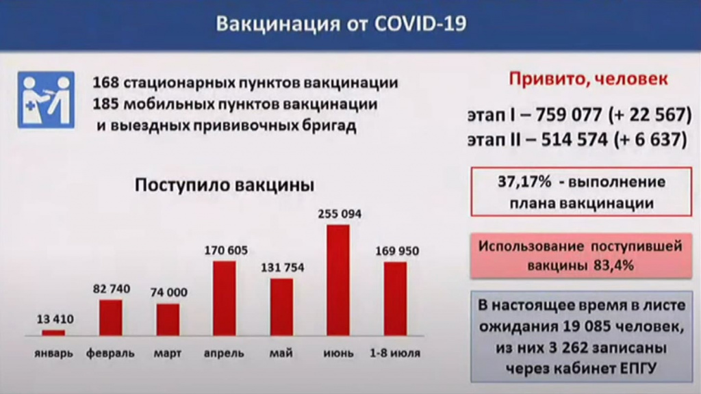 За первые 8 дней июля в Ростовскую область поступило 169950 доз вакцины. Для сравнения, за весь июнь регион получил 255 тысяч доз вакцины. И тогда это был месячный рекорд.