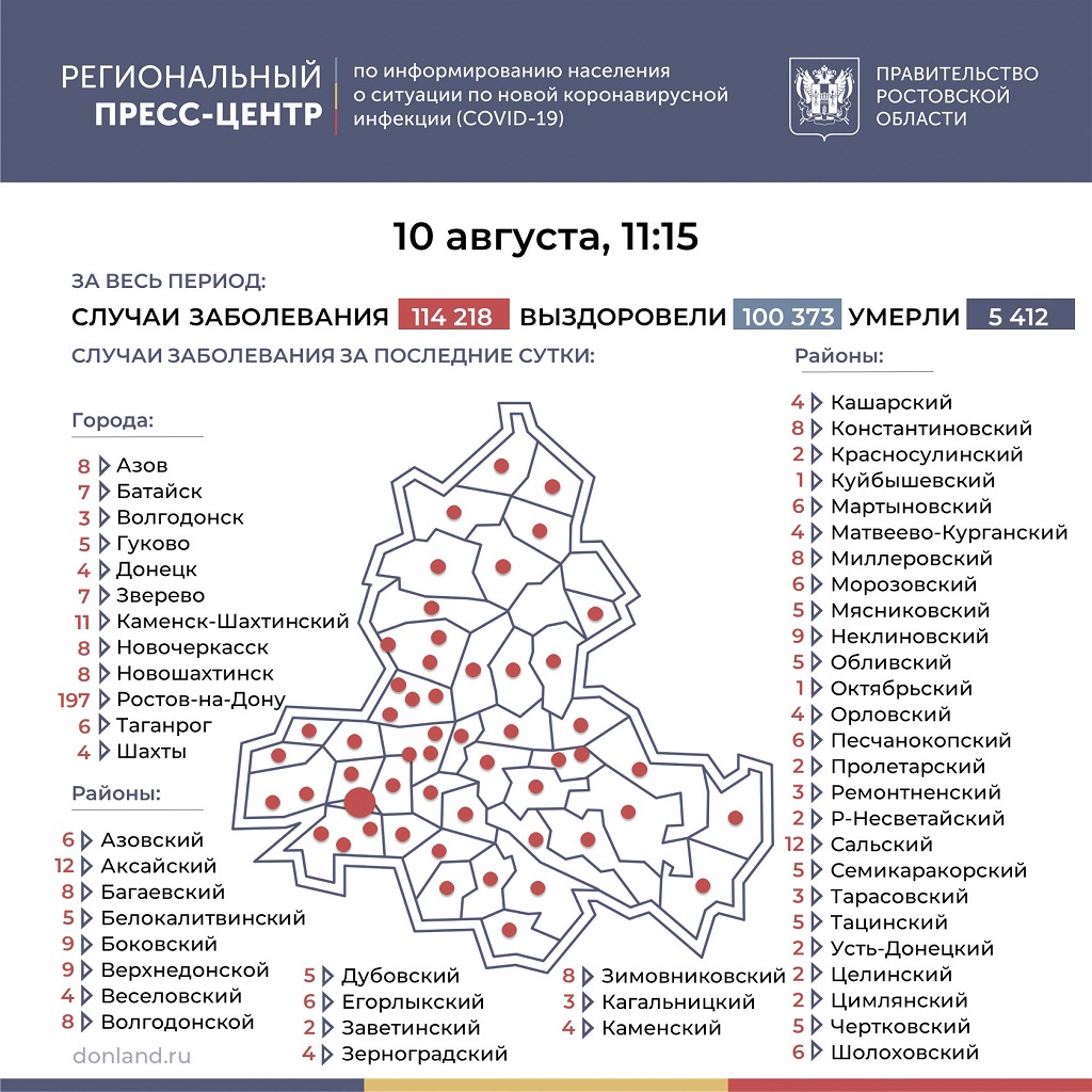 Больных выявили в 53 из 55 муниципалитетов. Больше всего — в Ростове (197), Аксайском и Сальском районах (по 12), Каменске-Шахтинском (11).