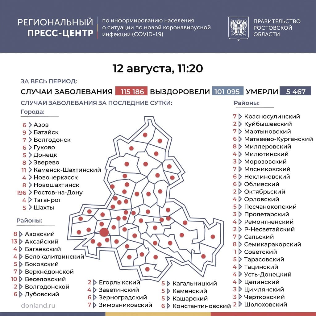 Заболевших обнаружили во всех городах и районах области. Традиционно больше всего в Ростове — 196 человек. Затем идут Аксайский район — 13 человек, Каменске-Шахтинский — 11 человек, Веселовский район — 10 человек.