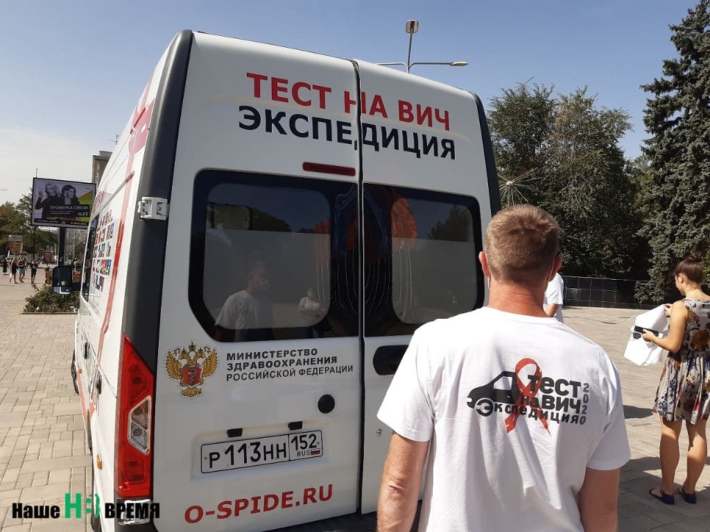 Белый микроавтобус с символикой акции «Тест на ВИЧ: Экспедиция 2021» будет работать с 10 утра до 2 часов дня у торгового центра «МегаМаг» на улице Пойменной, 1. А с 6 до 10 вечера — на Соборной площади.