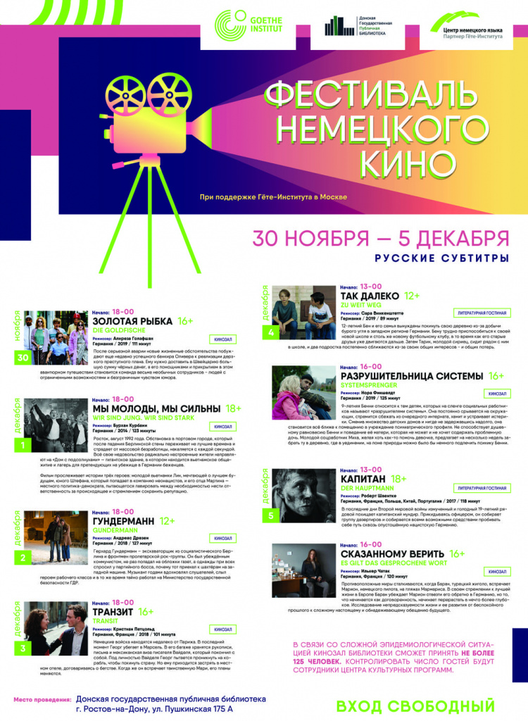 Немецкий культурный центр им. Гёте организовывает в кинозале ДГПБ бесплатный кинопоказ лучших за последние годы картин немецких режиссеров. В программе — восемь лент, вышедших в прокат с 2014 по 2019 годы. Фильмы предназначены для разных возрастных категорий, их будут демонстрировать с русскими субтитрами.