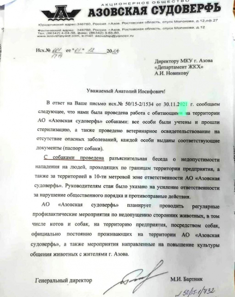 Как указывает автор письма, все собаки стерилизованы и чипированы — это значит, что ничего более с ними сделать владелец территории, где обитает стая собак, не имеет права. Разве что пытаться усовестить сучьих сынов все-таки не бросаться на посторонних людей — о чем, собственно, руководитель предприятия и написал.
