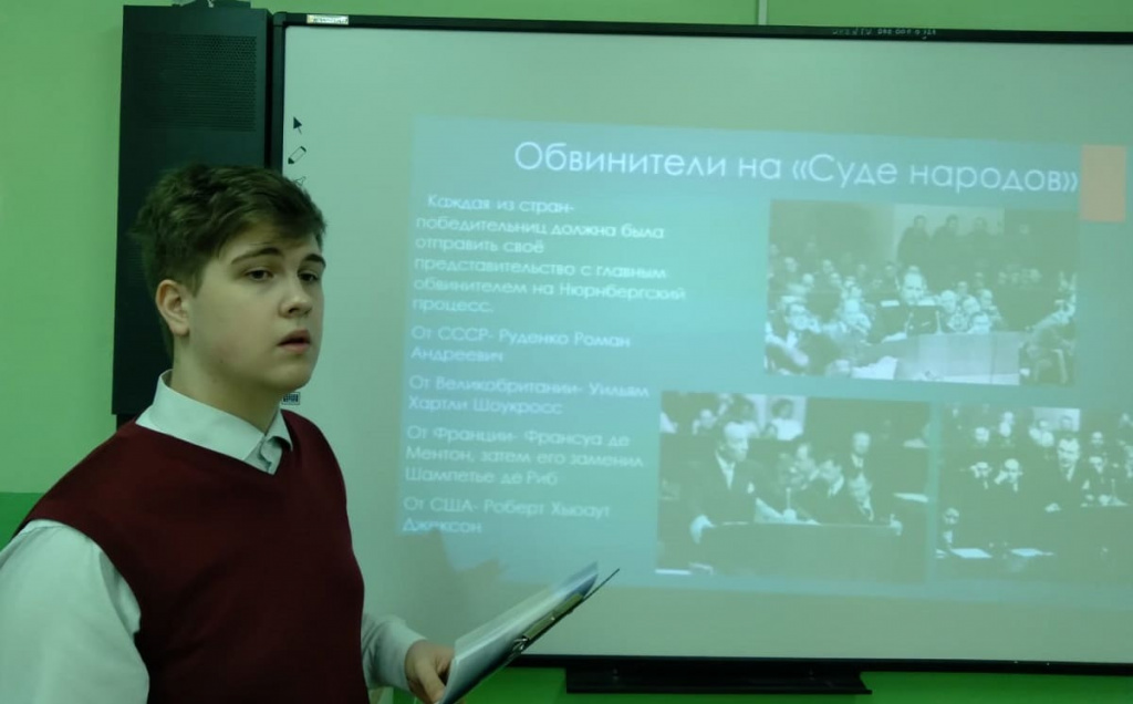 Несколько краеведов-старшеклассников подготовили на конференцию доклады, посвященные истории подготовки и проведения первого в мировой практике суда над военными преступниками.