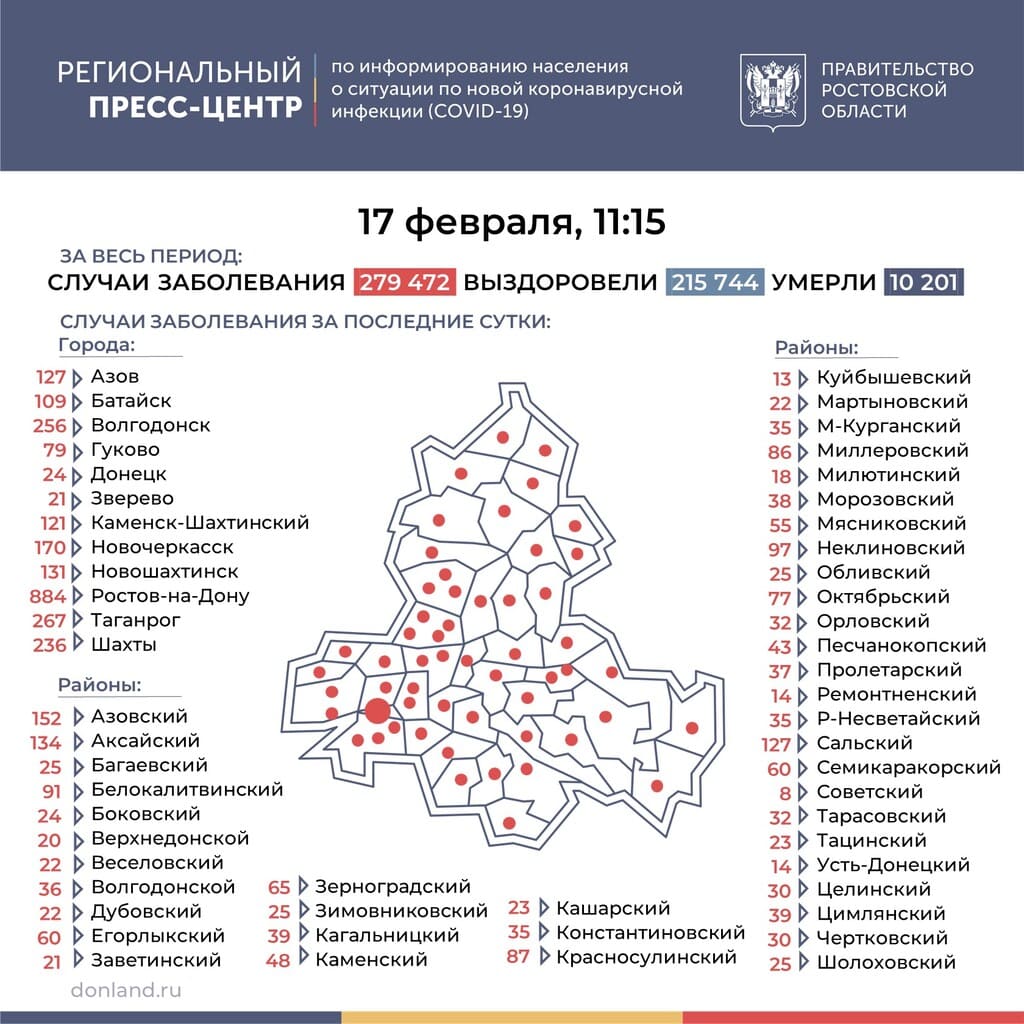 Новые случаи заболевания коронавирусной инфекцией выявлены на всей территории Ростовской области. Количество зараженных коронавирусом в Ростове-на-Дону снизилось до 884 человек в сутки, выросло число инфицированных среди жителей Таганрога — 267 случаев и Волгодонска — 256 случаев. Среди сельского населения наиболее высокие суточные показатели зафиксированы в Азовском районе — 152 заболевших, в Аксайском районе — 134 и в Белокалитвинском — 91.