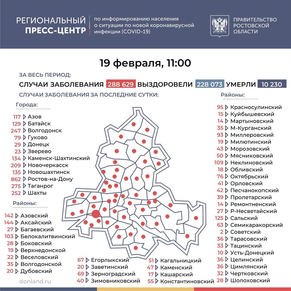 Новые случаи COVID-19 зарегистрированы за день во всех муниципалитетах Ростовской области. Среди городов региона больше всего заболевших в Ростове-на-Дону – 862 человека, в Таганроге — 275 и Шахтах — 252. Все больше сельских районов Ростовской области попадают в топ территорий со значительным суточным приростом инфицированных: в Аксайском районе — 144 заболевших, в Азовском районе — 142, в Сальском районе — 125 человек, в Неклиновском районе — 109, в Белокалитвинском — 103.