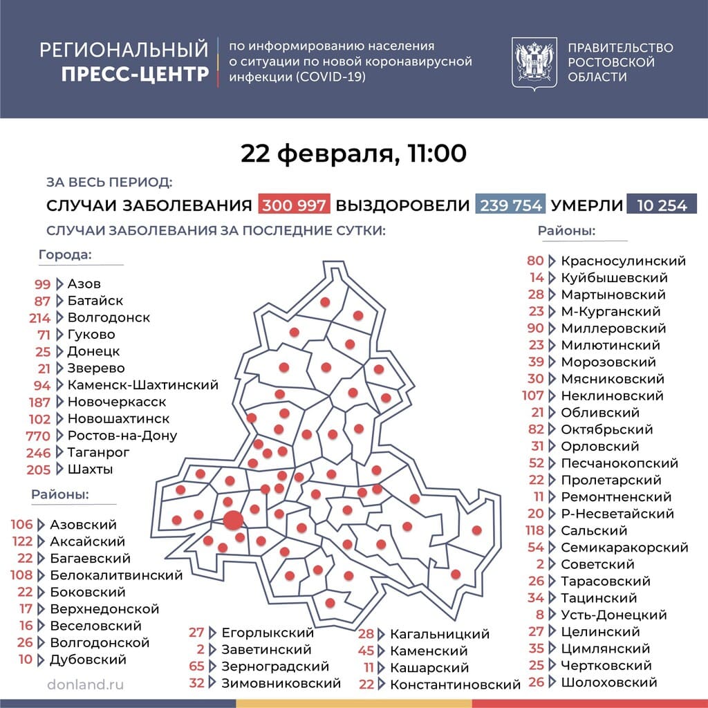 Новые случаи COVID-19 выявлены во всех донских муниципалитетах. Среди городов больше всего инфицированных коронавирусом выявили в Ростове-на-Дону — 770 человек, что значительно ниже показателей неделей ранее, в Таганроге — 246 человек, в Волгодонске — 214. Среди сельских районов: в Аксайском — 122 новых случая коронавирусной инфекции, в Сальском — 118, в Белокалитвинском — 108.
