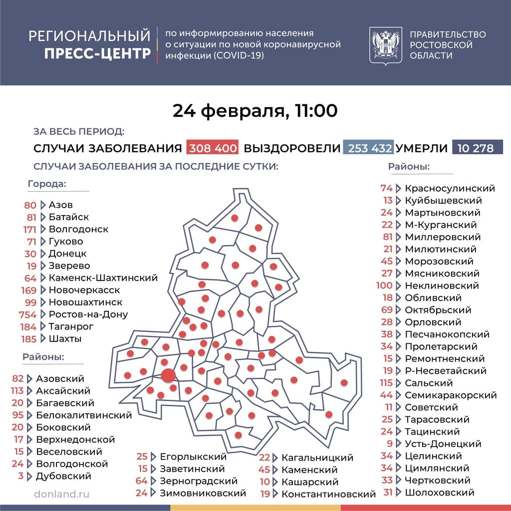 Во всех муниципалитетах Ростовской области за прошедшие сутки выявили новых зараженных коронавирусом SARS-CoV-2. В донских городах больше всего инфицированных выявили в Ростове-на-Дону — 754, в Шахтах — 185 и Таганроге — 184. Среди сельских районов лидируют Сальский — 115 заболевших за сутки, Аксайский — 113 случаев и Неклиновский — 100 случаев.