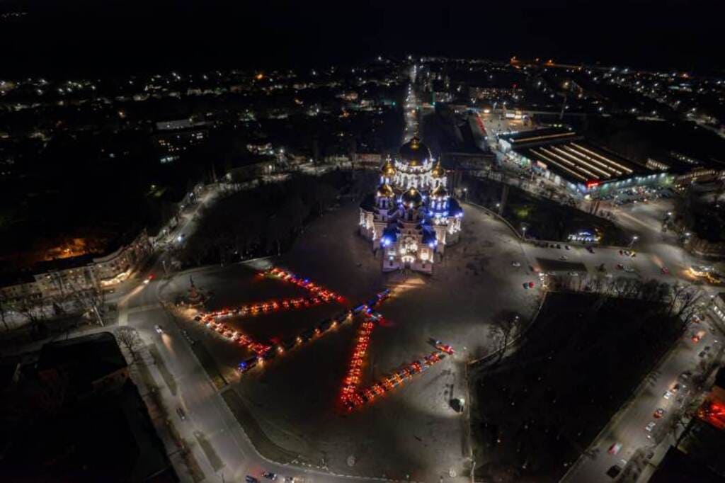 Более сотни жителей Новочеркасска и полтора десятка представителей пожарных частей и военных выстроились на площади перед Вознесенским собором в литеры Z и V. Именно эти символы, маркирующие группировки российских военных, участвующих во спецоперации, сейчас стали знаком поддержки россиянами работы по демилитаризации соседней страны. Когда стемнело, машины включили фары и спецподсветку — получившуюся картину засняли с помощью квадрокоптеров.