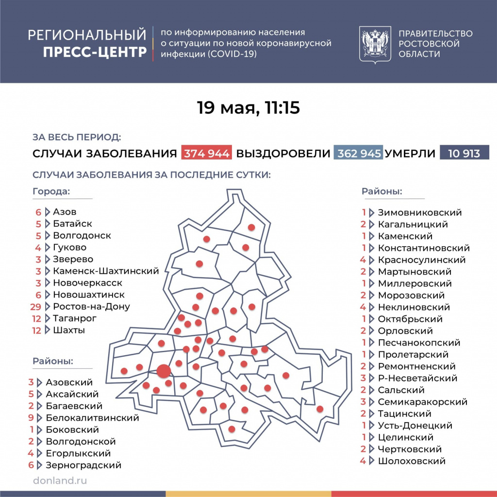 За вчерашние сутки в 41 муниципалитете Ростовской области выявили 163 больных ковидом. Это на 62 человека больше, чем было днем ранее.
