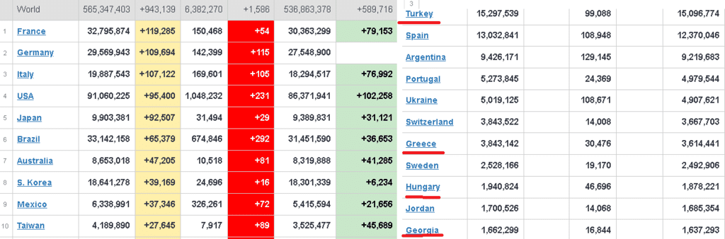 А вот среди продолжающих дотошно отмечать новые случаи COVID-19 странах ситуация не очень радужная: во Франции за сутки выявили более 199 тысяч новых случаев коронавирусной инфекции, в Германии — почти 110 тысяч, почти столько же в Италии, более 95 тысяч зараженных зафиксировали в США. Россия находится на 23-м месте по размеру суточного прироста новых случаев COVID-19 и на 12-м по числу новых жертв пандемии (43 погибших за сутки).