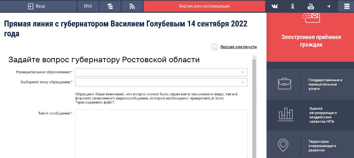 Задать свой вопрос губернатору Ростовской области можно на портале правительства Ростовской области. Для этого нужно заполнить специальную форму