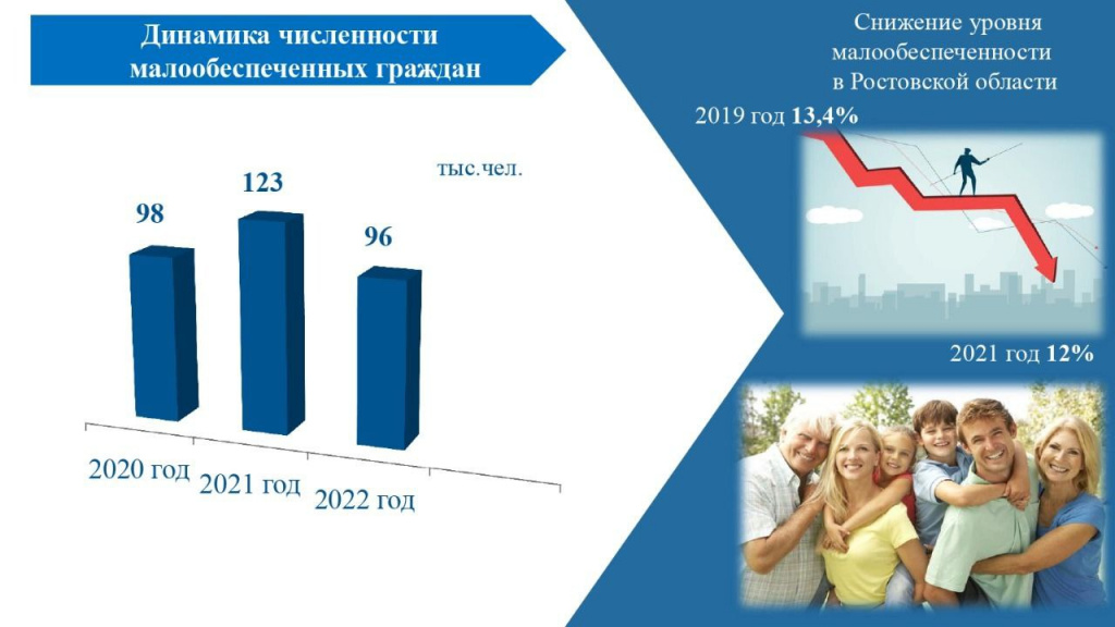 Уже два с половиной года в городе действует дорожная карта по реализации мероприятий по повышению благосостояния населения и снижению уровня бедности. Сегодня из почти 400 тысяч ростовчан, состоящих на учете в органах соцзащиты населения, 96 тысяч признаны малоимущими.