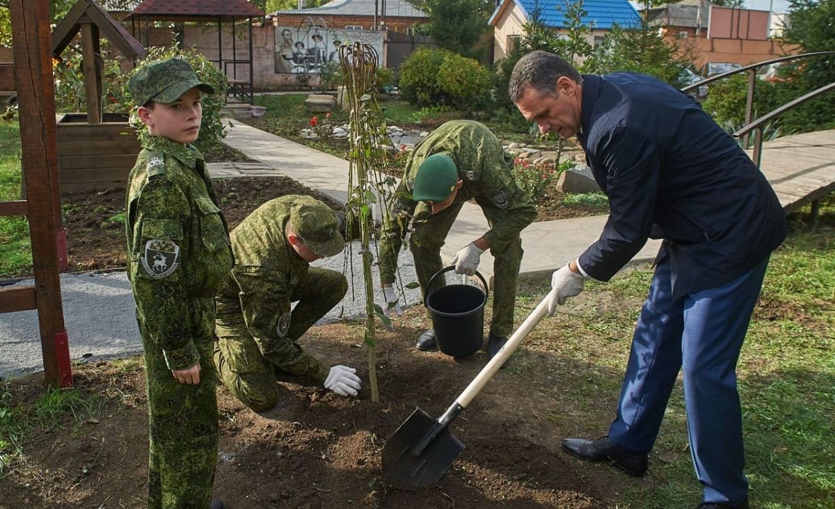 В Шахтинском Якова Бакланова казачьем кадетском корпусе вместе с кадетами в озеленении территории участвовали заместитель губернатора Ростовской области Михаил Корнеев и глава администрации города Андрей Ковалев.