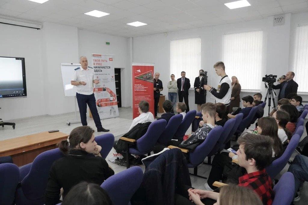 Директор техникума Ростовского государственного университета путей сообщения А. Мазуренко рассказал школьникам о создании в донском регионе отраслевого образовательно-производственного кластера железнодорожного транспорта на базе РГУПС, учебе в техникуме по образовательным программам «Профессионалитета», а также о трудоустройстве после учебы в компанию «Российские железные дороги».