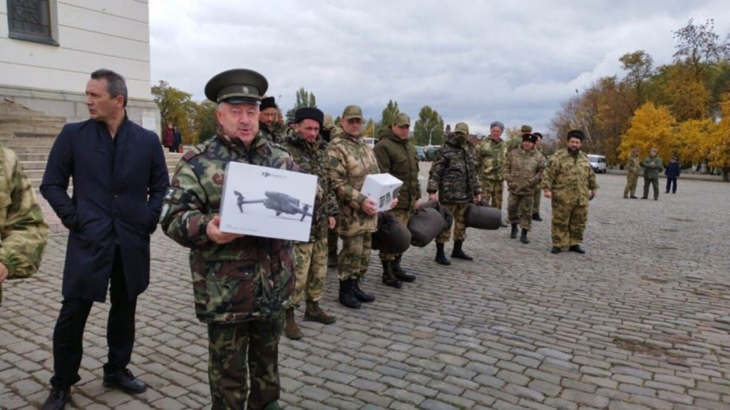 После молебна и торжественного построения донским казакам вручили снаряжение, собранное жителями и организациями Ростовской области. Это осенне-зимние комплекты одежды и другие нужные в полевых условиях вещи, рации и квадрокоптеры, а также два бронированных автомобиля.