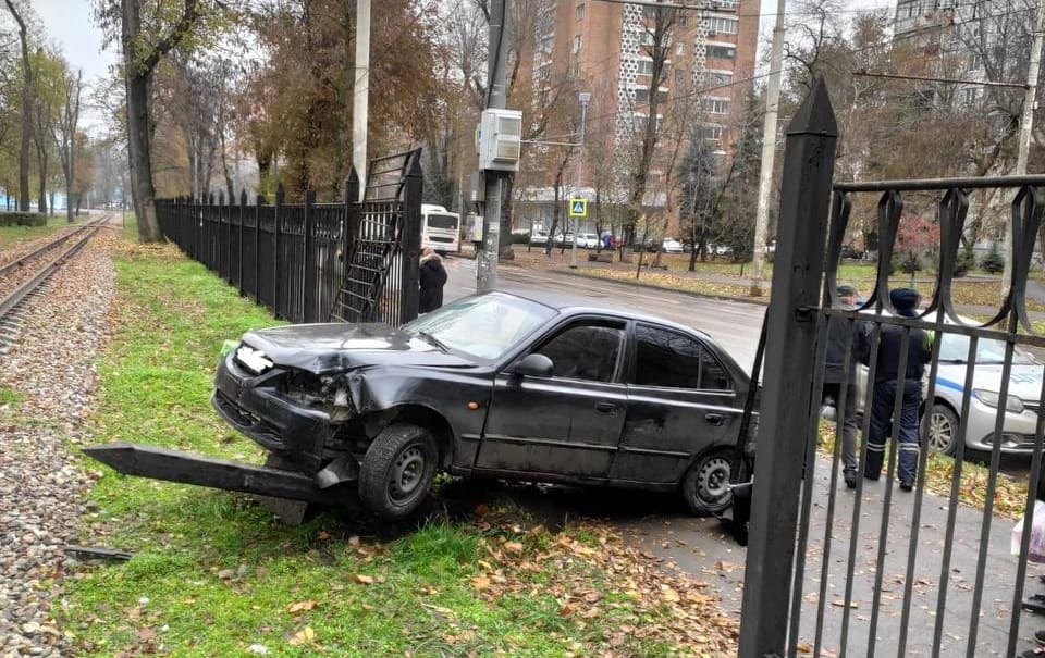 Сегодня во третьем часу дня в Ростове на проспекте Сельмаш в районе дома № 8 легковушка Hyundai Accent врезалась в рейсовый автобус № 54 Александровка — Темерник, после чего снесла забор в парке им. Островского.