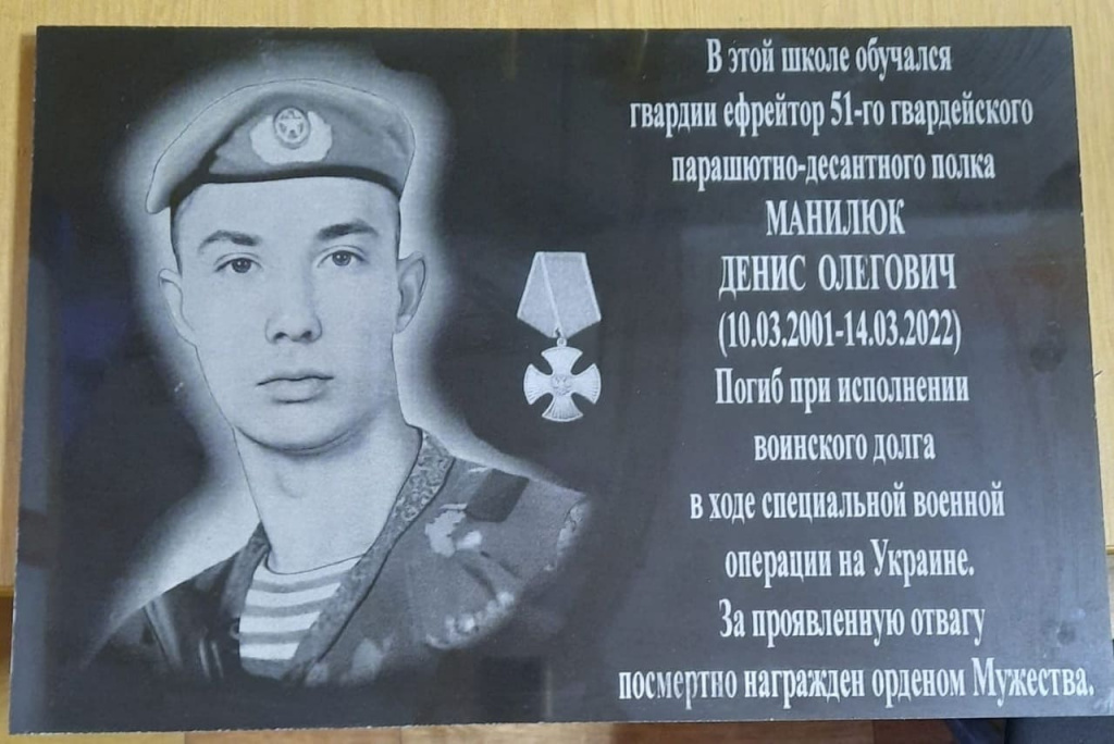 18 ноября мемориальная доска появилась и на школе в сальском селе Крученая Балка. Ее открыли в память о выпускнике Денисе Олеговиче Манилюке. Он служил в 51-м гвардейском парашютно-десантном полку. Ефрейтор Манилюк удостоен посмертно ордена Мужества.