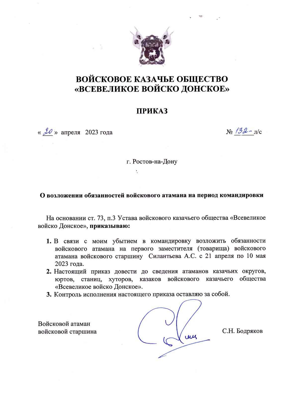 Убывая на полигон в подмосковное Алабино, соответствующий приказ подписал атаман войскового казачьего общества «Всевеликое войско Донское» Сергей Бодряков.