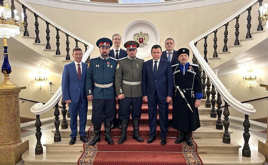 Помощник главы государства, председатель Совета по делам казачества Дмитрий Миронов встретился с командиром добровольческого казачьего отряда Олегом Ликонцевым, которому, как сообщала газета «Наше время», на днях присвоено звание Героя России, а также с другими казаками, награждёнными государственными наградами. Это удостоенные орденов Мужества Алексей Кайгородов и Сергей Мерзеликин.