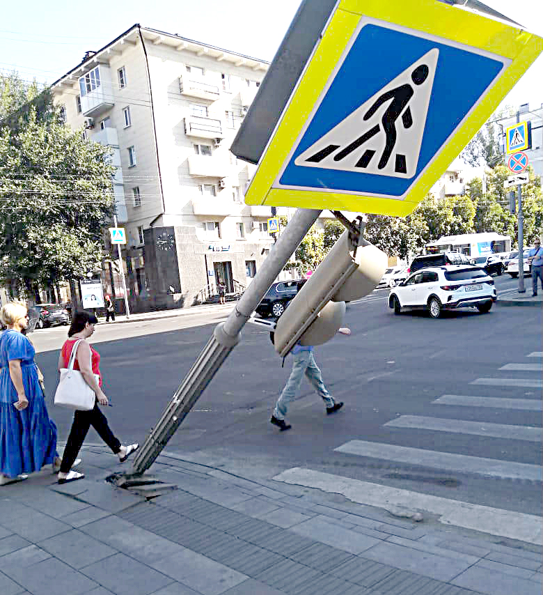 В самом центре донской столицы – на пересечении улицы Большая Садовая и проспекта Соколова – что называется, «с корнем» вырван внушительный железный стояк, на котором крепились светофор и дорожные знаки. И он расположен довольно далеко от проезжей части.