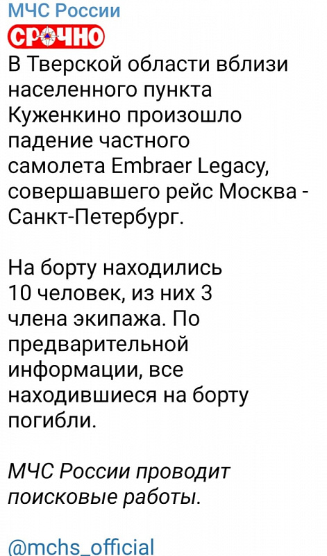 А вот в телеграмм-канале Росавиации было заявлено, что специально созданная комиссия приступила к расследованию обстоятельств и причин случившегося. Отмечается, что самолёт принадлежал ООО «МНТ-Аэро», специализирующегося на бизнес перевозках. По предварительным данным, на борту самолёта, совершавшего рейс по маршруту Москва – Санкт-Петербург, находились семь пассажиров и три члена экипажа. Про Пригожина здесь тоже нет упоминания. В официальном сообщении МЧС России в этой же сети о Пригожине тоже пока ни слова.