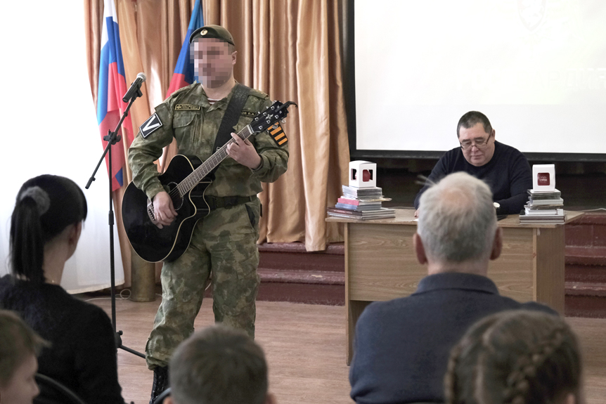 Член Союза писателей России полковник в отставке Андрей Эдоков, начальник отдела координации издательской деятельности, информационно-редакционных ресурсов и программ ДВСМИ Росгвардии полковник Михаил Сидоров и вокалист рок-группы «Взвод» прапорщик Евгений Жданов встретились со старшеклассниками и педагогами луганской школы.