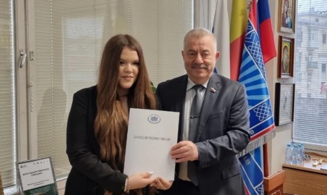 В Государственной Думе депутат российского парламента Виктор Водолацкий вручил благодарственное письмо учащейся 8 класса аксайского лицей № 1 Дарье Литвиновой.