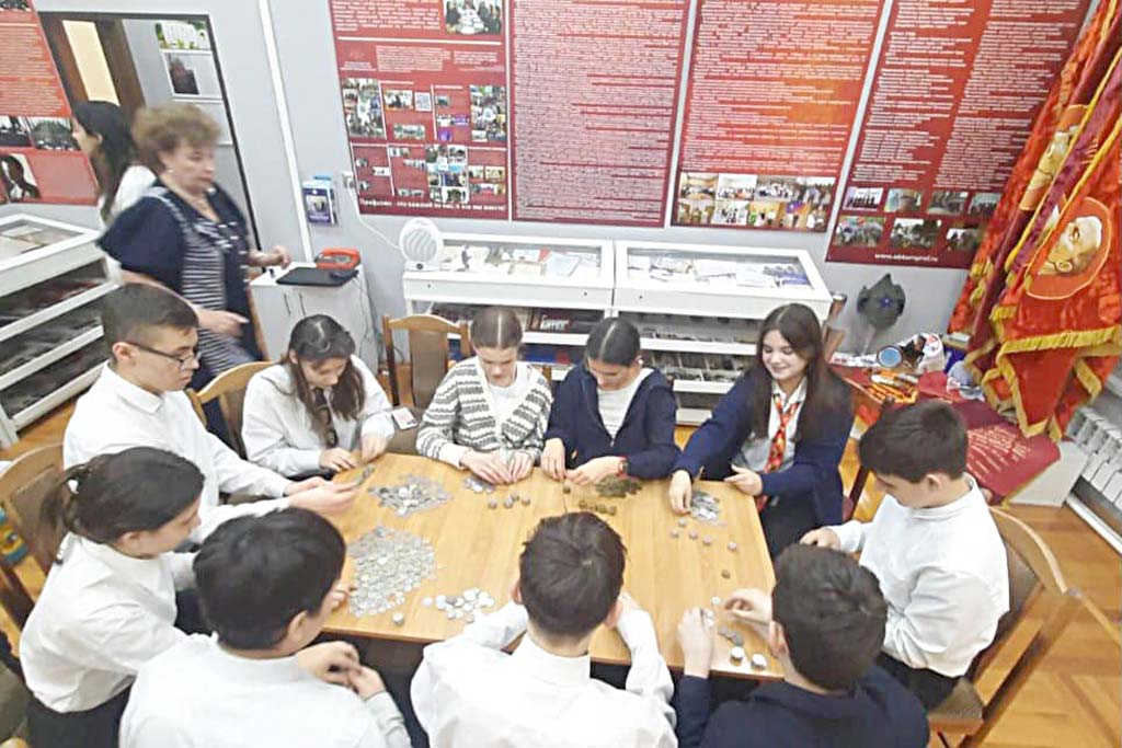 В Доме профсоюзов ученики ростовской школы № 49 помогли рассортировать собранные на памятник монеты.
