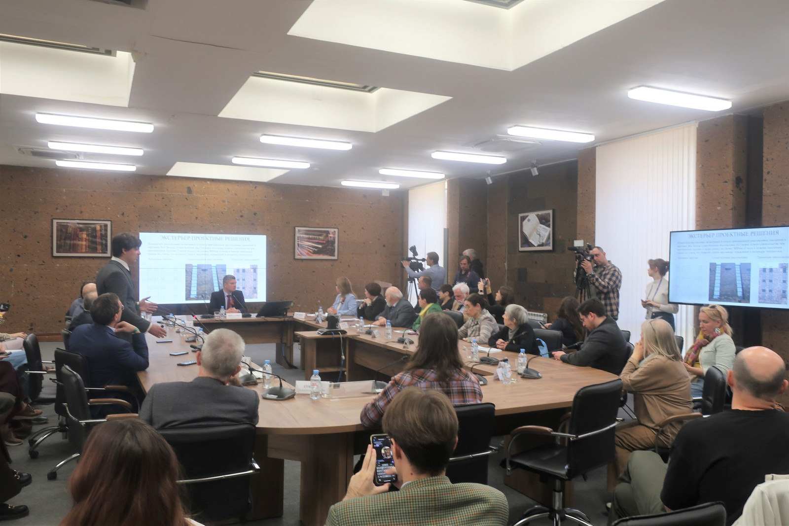 Начались вопросы из зала. Архитекторы обсуждали детали, предлагали возможные варианты решений, делали акцент на необходимости максимального сохранения первоначального облика здания и авторского замысла. Представители строительной отрасли в ответ говорили о нормативах, материалах, технических условиях.
