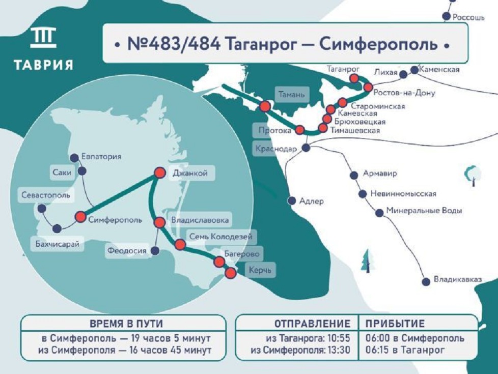 Он будет курсировать через день. В первый рейс из Таганрога (станция Таганрог Пассажирский) поезд отправился сегодня в 10:55.