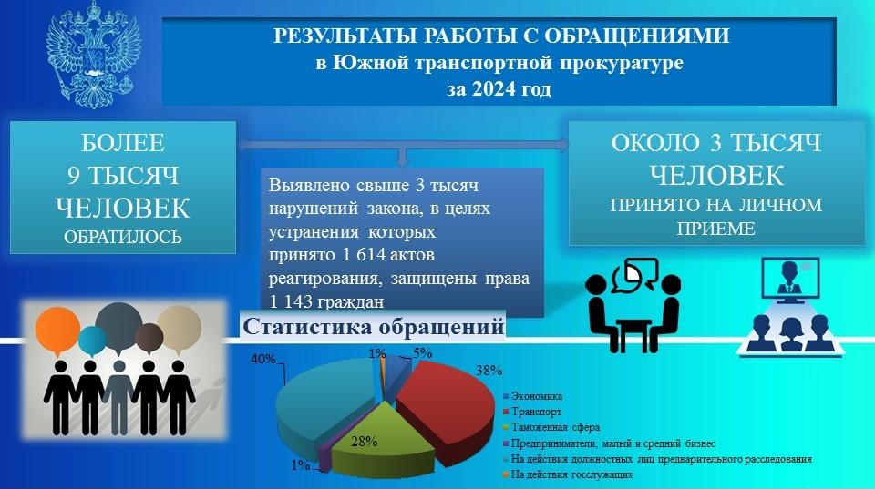 В Южной транспортной прокуратуре проинформировали о результатах работы по рассмотрению обращений и приему граждан за 2024 год. Сообщаем подробности.