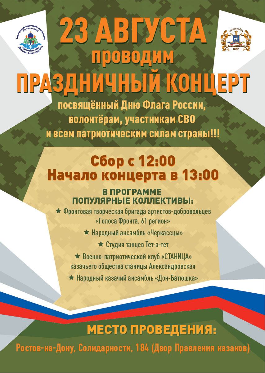 Ростовские казаки организуют праздничный концерт, посвященный Дню Государственного флага, волонтерам, участникам СВО и «всем патриотическим силам».
