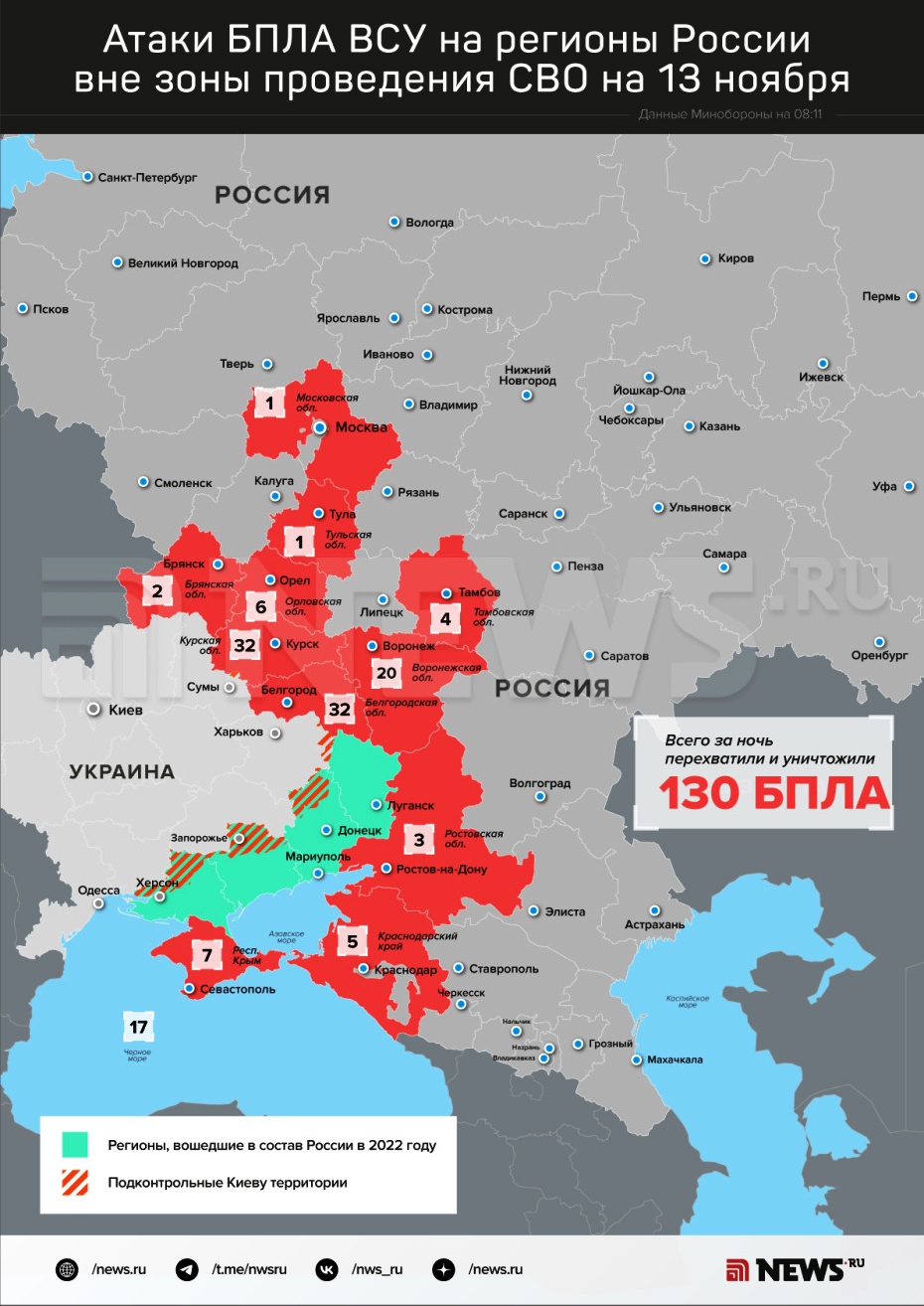 Если на Ростовскую область в две последние ночи было пущено относительно небольшое количество беспилотников, то сегодняшний налет на ряд других российских регионов носил отчетливо массированный характер. Согласно сообщению Минобороны страны, 130 украинских БпЛА атаковали в эту ночь 11 регионов России.
