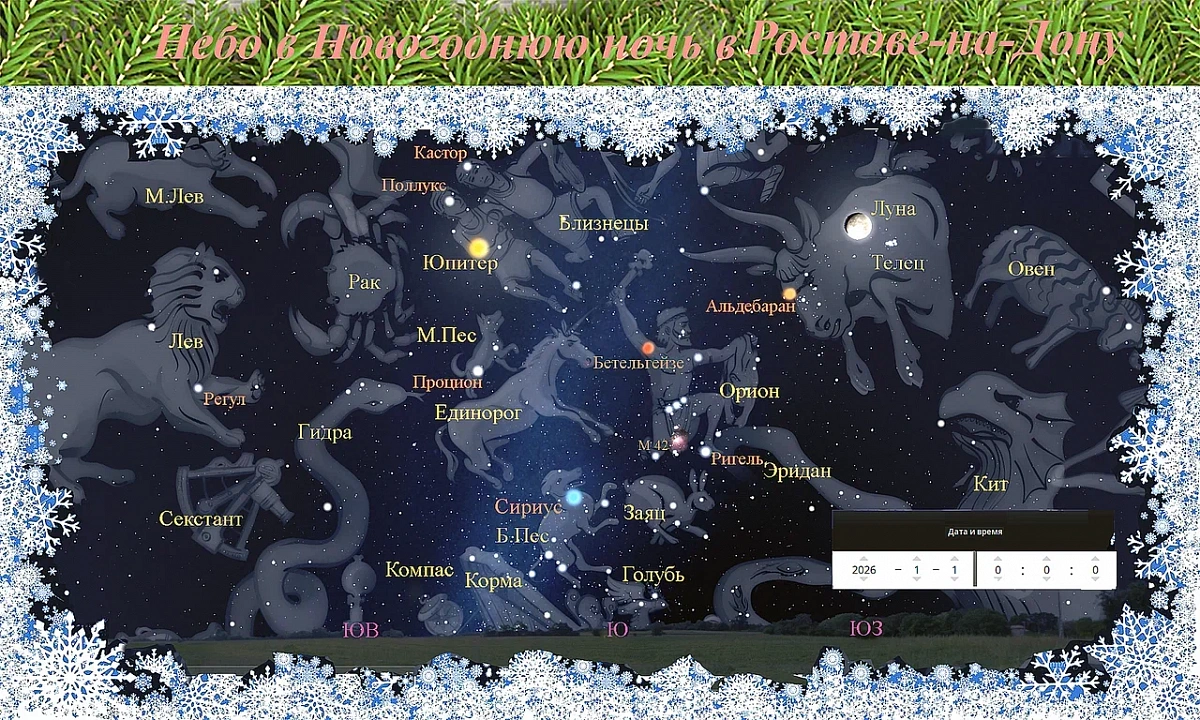 В этом «Наше время» заверили коллеги из Центра общественных коммуникаций Южного федерального университета. Вовсе не потому, что они преуспели вдруг в астрономии, став «по совместительству» обладателями самой звездной профессии. Они пошли проторенным путем — обратились к эксперту, который рассказал, какие звёзды и планеты будут видны в небе над Ростовом в новогоднюю ночь.